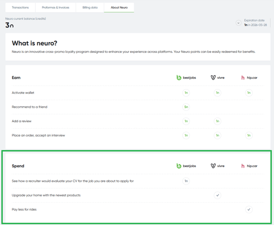 The types of services you can use your credits for are available in your account, on the Wallet page, under the About Neuro tab, in the Spend section at the bottom of the page.