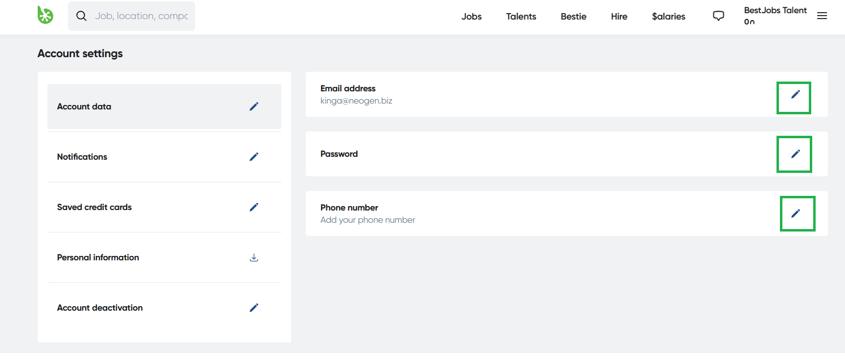 You can modify your contact details from your account by accessing the Account Settings menu, selecting the desired section, and clicking on the "Modify button ." If you want to change your email address, it is necessary to enter your current password.