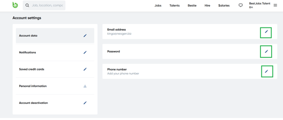 Click on the three lines in the upper right and access the Account Settings page. In the Account Data section, select the desired field and click on the pencil icon on the right. In the opened window, you can change your email address, password or phone number. If you want to change your email address, it is necessary to enter your current password.