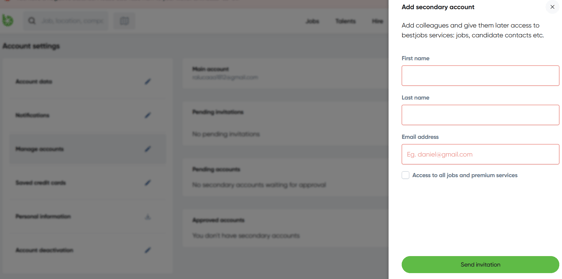 - Click on Add Secondary account, complete the required fields in the form, and click Send invitation.