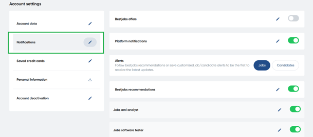 - Find the search you want to unsubscribe from and click on the activation/deactivation icon on the right. You can also delete a saved search: click the pencil icon next to the search, and in the window that opens, click the Delete button at the bottom.