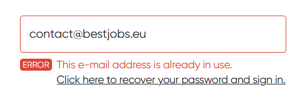 1. The email address is already in use:If you try to enter an email address and receive a notification that the email address is already used in another account, you can request password recovery and access the registered account with that email address. Alternatively, you can request the deletion of the account by writing to us at contact@bestjobs.eu. After the account is deleted, you will be able to use the email address in the desired account.