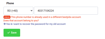 If you have another account with a different email address but the same entered phone number, the system will not allow you to create another account with the same phone number or modify it. You can recover your old account by clicking on Yes, I want to recover the password for my old account and enter the email or phone number from the old account to reset the password. If you need assistance, please contact us at contact@bestjobs.eu.