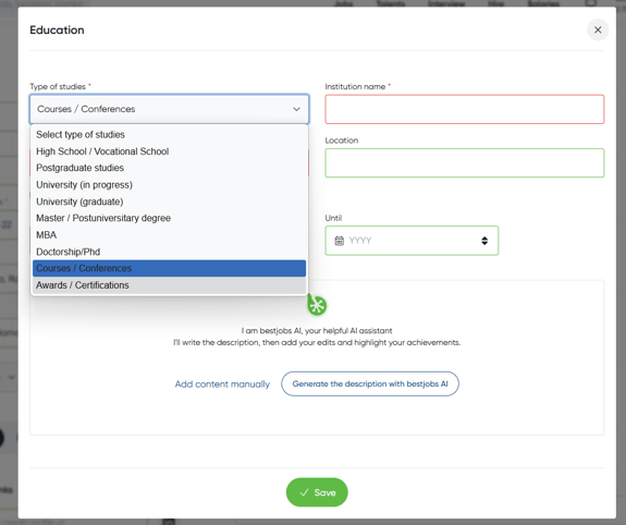- In the window that opens, under Type of Studies, select Courses / Conferences or Awards / Certifications, complete the other fields with the relevant information, and then click Save.