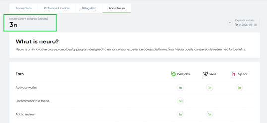The available credit balance can be viewed in your account, under the Wallet section, in the Neuro Current Balance (credits) field.