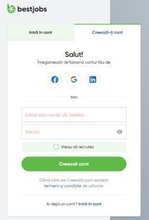 Intra pe www.bestjobs.eu, click în colțul din dreapta sus pe butonul Intră / Creează-ți cont și apoi alege tab-ul Creează-ți cont.