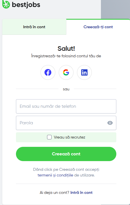 Introdu adresa de e-mail sau numărul de telefon pe care dorești să îl folosești pentru înregistrare și setează o parolă unică. Bifează opțiunea „Vreau să recrutez” pentru a crea contul de angajator.
