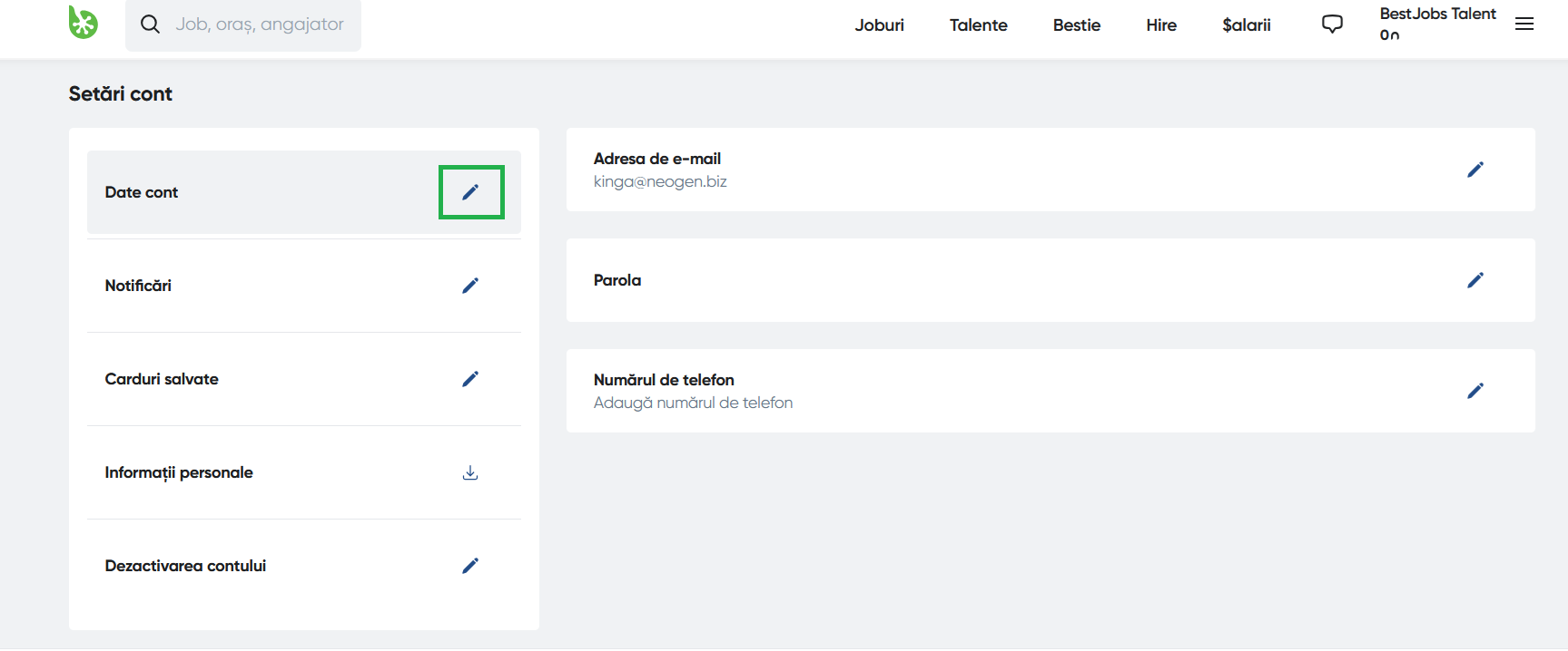 Datele de contact le poți modifica din contul tău. Dă clic pe cele trei linii din dreapta sus și accesează pagina Setări cont. La Date cont, alege secțiunea dorită și dă clic pe iconul cu creion din dreapta acesteia. În fereastra deschisă, poți modifica adresa de email, parola sau numărul de telefon.